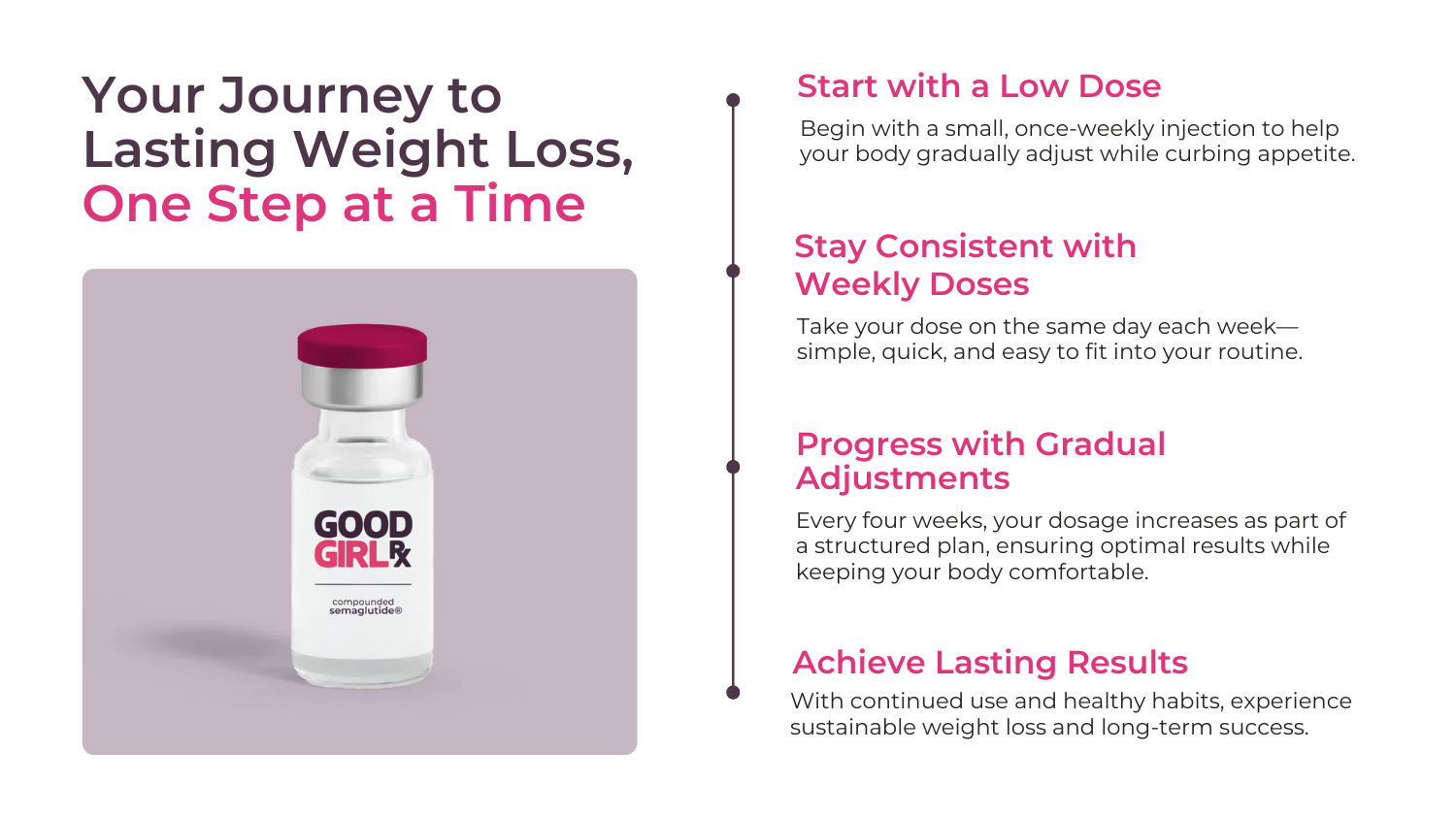 Stay on track with regular check-ins, updates, and expert guidance—plus, message your provider anytime through the Good Girl RX patient portal for ongoing support.