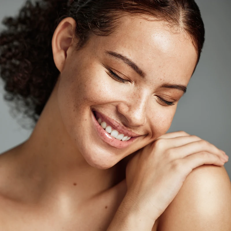 Woman with hydrated glowing skin covered in water droplets showcasing skincare and anti-aging wellness benefits